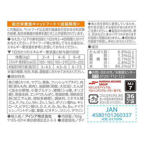 | 原材料 | 魚介類(カツオ、マグロ、青魚、フィッシュペプチド)、肉類(鶏もも肉、鶏肉)、油脂類(鶏脂、大豆油)、たんぱく加水分解物、小麦グルテン、糖類(ショ糖、オリゴ糖)、乾燥全卵、エンドウたんぱく、乾燥卵黄、増粘安定剤(加工でん粉、増粘多糖類)、調味料、ミネラル類(Ca、P、Fe、Cu、Mn、Zn、I、Se)、ポリリン酸Na、キシロース、ビタミン類(A、D、E、K、B1、B2、B6、B12、ナイアシン、パントテン酸、葉酸、ビオチン、コリン)、タウリン |