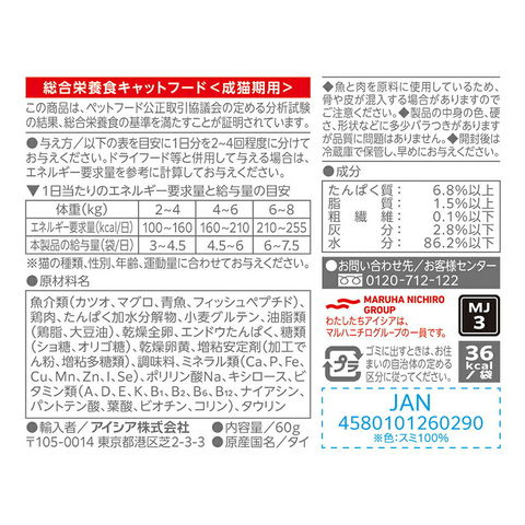 | 原材料 | 魚介類(カツオ、マグロ、青魚、フィッシュペプチド)、鶏肉、たんぱく加水分解物、小麦グルテン、油脂類(鶏脂、大豆油)、乾燥全卵、エンドウたんぱく、糖類(ショ糖、オリゴ糖)、乾燥卵黄、増粘安定剤(加工でん粉、増粘多糖類)、調味料、ミネラル類(Ca、P、Fe、Cu、Mn、Zn、I、Se)、ポリリン酸Na、キシロース、ビタミン類(A、D、E、K、B1、B2、B6、B12、ナイアシン、パントテン酸、葉酸、ビオチン、コリン)、タウリン |