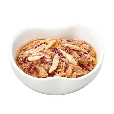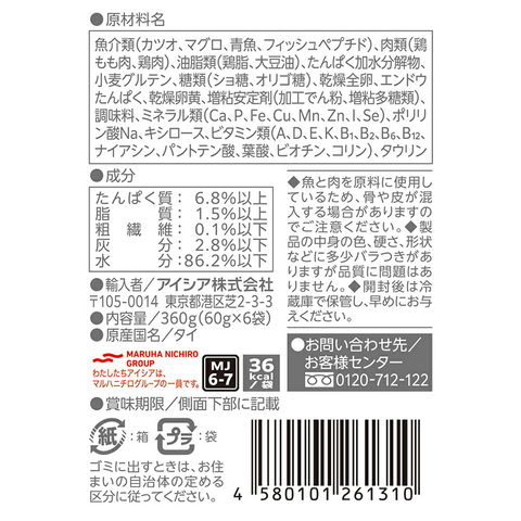 原材料 魚介類(カツオ、マグロ、青魚、フィッシュペプチド)、肉類(鶏もも肉、鶏肉)、油脂類(鶏脂、大豆油)、たんぱく加水分解物、小麦グルテン、糖類(ショ糖、オリゴ糖)、乾燥全卵、エンドウたんぱく、乾燥卵黄、増粘安定剤(加工でん粉、増粘多糖類)、調味料、ミネラル類(Ca、P、Fe、Cu、Mn、Zn、I、Se)、ポリリン酸Na、キシロース、ビタミン類(A、D、E、K、B1、B2、B6、B12、ナイアシン、パントテン酸、葉酸、ビオチン、コリン)、タウリン