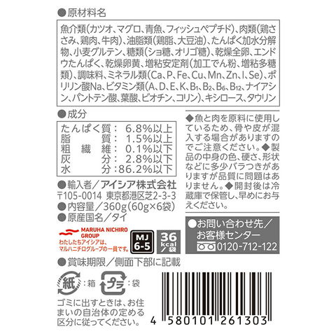 | 原材料 | 魚介類(カツオ、マグロ、青魚、フィッシュペプチド)、肉類(鶏ささみ、鶏肉、牛肉)、油脂類(鶏脂、大豆油)、たんぱく加水分解物、小麦グルテン、糖類(ショ糖、オリゴ糖)、乾燥全卵、エンドウたんぱく、乾燥卵黄、増粘安定剤(加工でん粉、増粘多糖類)、調味料、ミネラル類(Ca、P、Fe、Cu、Mn、Zn、I、Se)、ポリリン酸Na、ビタミン類(A、D、E、K、B1、B2、B6、B12、ナイアシン、パントテン酸、葉酸、ビオチン、コリン)、キシロース、タウリン |