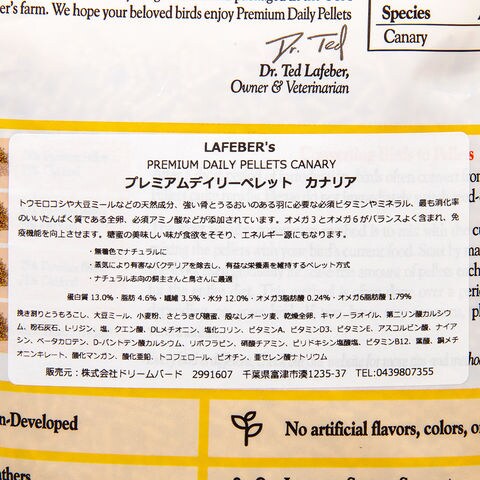 【ラフィーバ プレミアムデイリーペレット カナリア】 挽き割りとうもろこし、大豆ミール、小麦粉、さとうきび糖蜜、殻なしオーツ麦、乾燥全卵、キャノーラオイル、第二リン酸カルシウム、粉石灰石、L-リジン、塩、クエン酸、DLメチオニン、塩化コリン、ビタミンA、ビタミンD3、ビタミンE、アスコルビン酸、ナイアシン、ベータカロテン、D-パントテン酸カルシウム、リボフラビン、硝酸チアミン、ピリドキシン塩酸塩、ビタミンB12、葉酸、銅メチオニンキレート、酸化マンガン、酸化亜鉛、トコフェロール、ビオチン、亜セレン酸ナトリウム 【ラフィーバ プレミアムデイリーペレット パラキート】 挽き割りとうもろこし、大豆ミール、小麦粉、さとうきび糖蜜、挽き割りオーツ麦、全卵、キャノーラ油、第二リン酸カルシウム、粉石灰石、L-リジン、食卓塩、クエン酸、DLメチオニン、塩化コリン、ビタミンA群、ビタミンD3群、ビタミンE群、アスコルビン酸、ナイアシン、β-カロテン、D-パントテン酸カルシウム、リボフラビン、硝酸チアミン、ピリドキシン塩酸塩、ビタミンB12、葉酸、銅リジン、酸化マンガン、酸化亜鉛、混合トコフェロール、ビオチン、セレニウム |