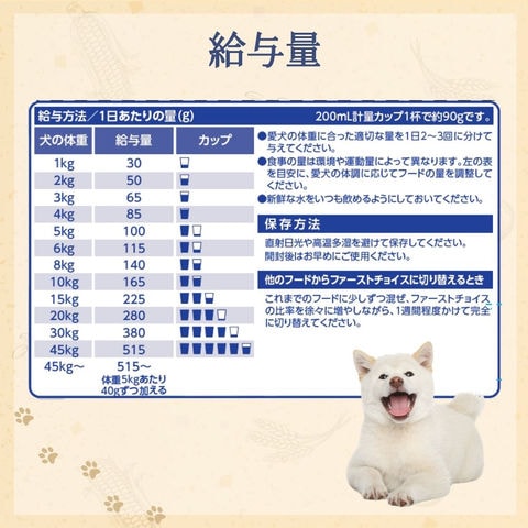 | 原材料 | えんどう豆、白身魚※、さつまいも、ビートパルプ、えんどう豆でんぷん、亜麻仁(オメガ3・6脂肪酸源)、アルファルファ、鶏脂、たん白加水分解物、サーモンオイル(DHA源)、酵母エキス(マンナンオリゴ糖)、チコリ(イヌリン源)、コリン、グルコサミン、ユッカ抽出エキス、L-カルニチン、ビタミン類(A、B1、B2、B6、B12、D3、E、ナイアシン、パントテン酸、ビオチン、葉酸)、ミネラル類(亜鉛、カルシウム、クロライド、セレン、鉄、銅、ナトリウム、マンガン、ヨウ素、リン)、酸化防止剤(ビタミンE) ※コンドロイチンは白身魚由来です |