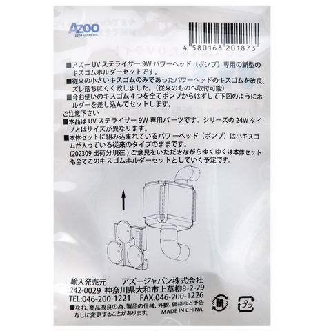 | 特長 | ●アズー UVステライザー 9W専用の交換用新型キスゴムホルダーセットです。 ●劣化した際の交換用や、予備として持っておくのもおすすめです。 |