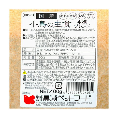 黒瀬ペットフード 国産小鳥の主食 4種ブレンド 4972228224031 小動物 鳥 フード 飼料 総合栄養 小鳥全般 文鳥 ブンチョウ 小型インコ セキセイインコ カナリア カナリアシード アワ 粟 稗 ヒエ 黍 キビ 種 穀物 シード 餌 えさ ゴハン ご飯 kurosekokusan まとめ買い まとめ kak 20240622 y24m06
