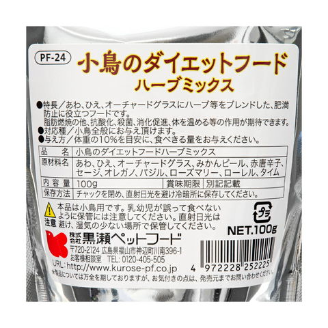 _animal 黒瀬ペットフード 小鳥のダイエットフードハーブ 100g 4972228252225 小動物 鳥 小鳥全般 フード 餌 エサ おやつ 小型インコ 中型インコ フィンチ カナリア セキセイインコ オカメインコ ブンチョウ 文鳥 十姉妹 ジュウシマツ あわ ひえ オーチャードグラス みかんピール 赤唐辛子 セージ オレガノ バジル ローズマリー ローレル タイム 粟 稗 まとめ買い まとめ kak 20240622 y24m06
