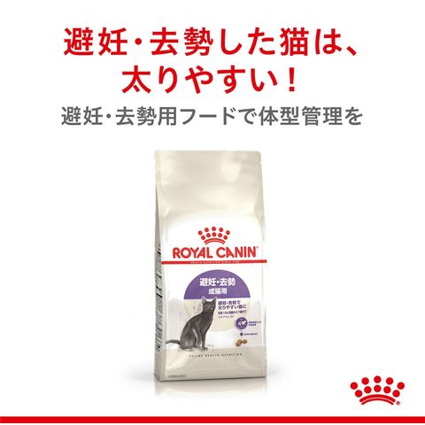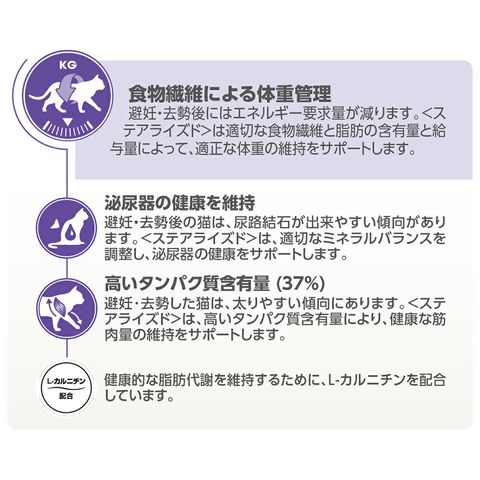 | 特長 | ●ホルモンバランスが変化して太りやすくなる、避妊・去勢後にぴったりなフードです。 ●適切な食物繊維と脂肪の含有量と、フードの給与量によって、適正な体重の維持をサポートします。 ●避妊・去勢後の猫ちゃんは尿路結石ができやすい傾向があるため、適切なミネラルバランスを調整し、泌尿器の健康をサポートします。 ●高いタンパク質含有量により、健康的な筋肉量の維持をサポートします。 ●健康的な脂肪代謝を維持するために、L-カルニチンを配合しています。 |