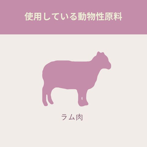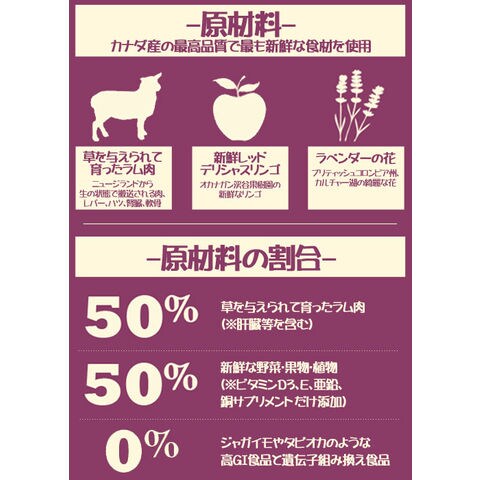 | 特長 | ●肉原材料は低アレルギー性のラム肉のみ。 ●穀類、ジャガイモ、タピオカ不使用お腹の調子を整える食物繊維を含有。 ●お腹の調子を整える食物繊維を含有。 |