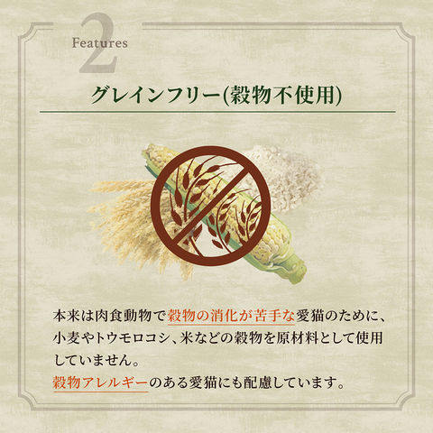 ●厳選された高品質な鶏肉を栄養素やチキンの旨味が残りやすい「フリーズドライ製法」で加工しています。お肉本来の旨味や栄養がしっかり詰まったフリーズドライチキンが入った、特別なご飯です。 【高タンパク】 ●健康な筋肉の維持には、若いうちから必要な栄養素をしっかり摂取することが大切です。 【グレインフリー(穀物不使用)】 ●本来は肉食動物で穀物の消化が苦手な愛猫のために、小麦やトウモロコシ、米などの穀物を原材料として使用していません。穀物アレルギーのある愛猫にも配慮しています。 【高品質な原料】 ●高品質な肉や魚が第一主原料、素材本来の美味しさをそのまま封じ込めました。 |