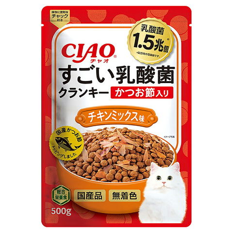 メーカー画像 いなば CIAO すごい乳酸菌クランキー かつお節入り チキンミックス味 500g 12個 猫用 猫 ねこ キャットフード フード えさ 餌 猫フード ドライ 粒 カリカリ クランキー ミックス マグロ カツオ かつお節 チキン 鮪 鰹 国産 無着色 乳酸菌 チャオ INABA チャック付き 2250003094331 20240726 y24m07 ktym 鰹節 ねこフード ドライフード キャット CAT 愛猫
