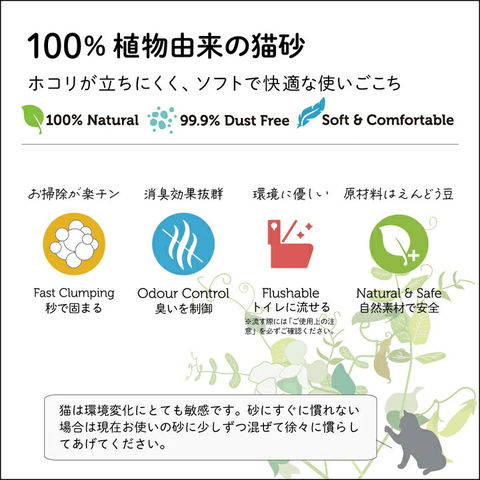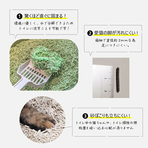 | ご注意 | ※本品は猫用トイレの砂です。目的以外の用途では使用しないでください。 ※猫が慣れない場合は、以前にご使用の猫砂に混ぜて少しずつ切り替えてください。 ※本品は食べ物ではありません。誤食を防ぐため乳幼児や認知症の方、ペットの手の届かない場所に保管してください。 ※尿などで砂が汚れると固まり難くなります。定期的に砂を全て交換されることをおすすめします。 ※本品はトイレに流せますが必ず少量ずつ流すようにしてください。可燃ゴミでの廃棄方法は、お住まいの地域のルールに従って処分してください。 ※トイレに流す際、浄化槽トイレには絶対に流さないでください。故障の原因になります。 |