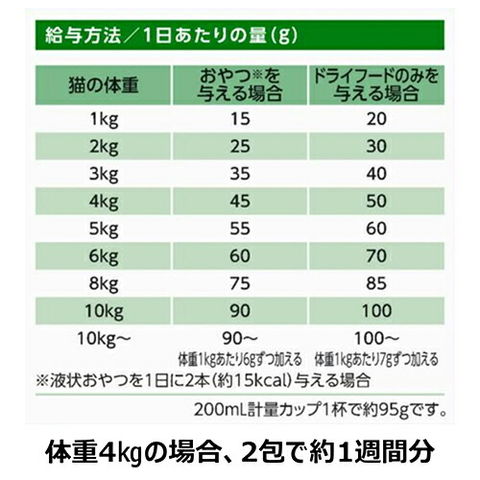 | 原材料 | 鶏肉、玄米、コーン、じゃがいもでんぷん、鶏脂、オートブラン、たん白加水分解物、セルロース、亜麻仁(オメガ3・6脂肪酸源)、サーモンオイル(DHA源)、大豆レシチン、酵母、酵母エキス(マンナンオリゴ糖)、チコリ(イヌリン源)、硫酸水素ナトリウム、メチオニン、コリン、タウリン、ユッカ抽出エキス、L-カルニチン、ビタミン類(A、B1、B2、B6、B12、C、D3、E、ナイアシン、パントテン酸、ビオチン、葉酸)、ミネラル類(亜鉛、カリウム、カルシウム、クロライド、セレン、鉄、銅、ナトリウム、マンガン、ヨウ素)、酸化防止剤(ビタミンE) |