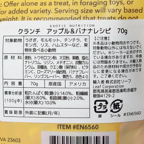 EXOTIC NUTRITION CRUNCHEZ APPLE&BANANA RECIPE 70g 0810012546560 エキゾチックニュートリション 小動物 おやつ 副食 エサ フード フルーツ 果物 ビタミン ミネラル リンゴ りんご バナナ うさぎ ウサギ モルモット チンチラ モモンガ フクロモモンガ リス シマリス ハムスター ジャンガリアンハムスター ゴールデンハムスター キンクマ 20240916 y24m09 kszk クランチアップル&バナナレシピ exonutribanner