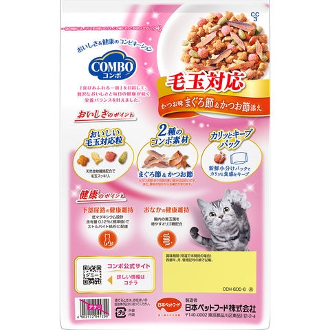 メーカー画像 コンボ キャット 毛玉対応 かつお味・まぐろ節・かつお節添え 600g(120g×5袋)×12 4902112047224 20240831 y24m08 mikari 猫 ねこ 猫用 ねこ用 cat 猫フード キャットフード ペットフード フード 餌 エサ ごはん ドライフード ドライ 総合栄養食 オールステージ 全成長段階 毛玉 毛球 低マグネシウム 善玉菌 オリゴ糖 クランベリー ハーブ 小分け ngwordCHK_OK 2250003104368