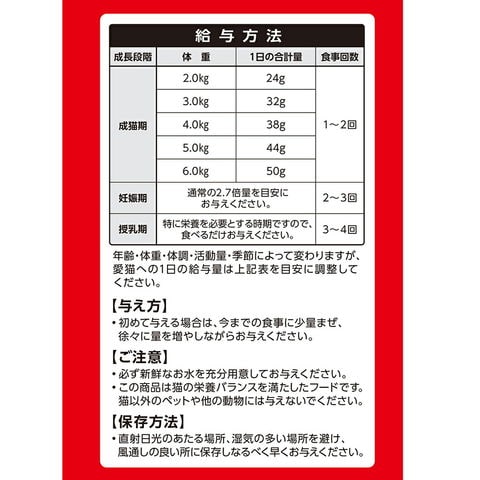 | ご注意 | ※本品は成猫用です。対象年齢以外の猫には与えないでください。 |