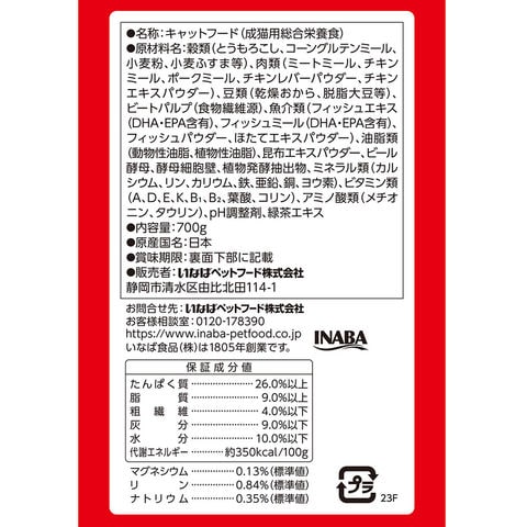 | 原材料 | 穀類(とうもろこし、コーングルテンミール、小麦粉、小麦ふすま等)、肉類(ミートミール、チキンミール、ポークミール、チキンレバーパウダー、チキンエキスパウダー)、豆類(乾燥おから、脱脂大豆等)、ビートパルプ(食物繊維源)、魚介類(フィッシュエキス(DHA、EPA含有)、フィッシュミール(DHA、EPA含有)、フィッシュパウダー、ほたてエキスパウダー)、油脂類(動物性油脂、植物性油脂)、昆布エキスパウダー、ビール酵母、酵母細胞壁、植物発酵抽出物、ミネラル類(カルシウム、リン、カリウム、鉄、亜鉛、銅、ヨウ素)、ビタミン類(A、D、E、K、B1、B2、葉酸、コリン)、アミノ酸類(メチオニン、タウリン)、pH調整剤、緑茶エキス |