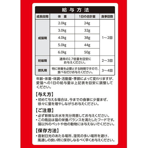 | ご注意 | ※本品は成猫用です。対象年齢以外の猫には与えないでください。 |
