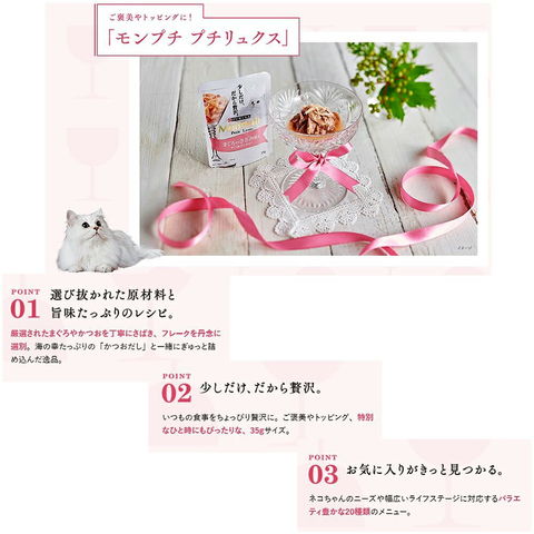 | 特長 | ●厳選されたまぐろ、かつおにしらすを添え、お魚の旨みたっぷりのジュレと一緒に味わう贅沢な美味しさのウェットフードです。 ●ジュレの滑らかな質感が猫の食欲を刺激します。 |