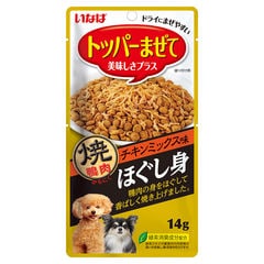 | 原材料 | 鶏肉(ささみ)、チーズ、チキンエキス、チキンパウダー、酵母エキス、増粘安定剤(増粘多糖類、加工でん粉)、ビタミンE、緑茶エキス、カラメル色素、パプリカ色素 |