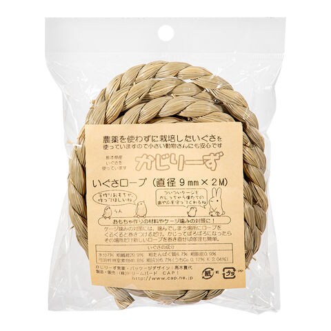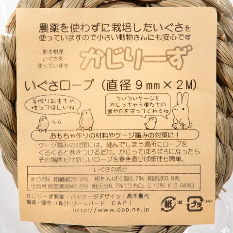 ●農薬不使用、無漂白のいぐさを使用した安心の鳥向けおもちゃです。 ●国産のいぐさを使っています。加工の際、粘土や水を使いますが、薬品・油の使用、染色・漂白はしておりません。 ●無農薬栽培のいぐさでつくったロープ(直径9mm)です。 ●ロープは鳥さんのおもちゃづくりにおすすめです。 ●ほかにも、ケージに巻きつけて”ケージかじり”の防止や緩和にぜひお役立てください。 |
