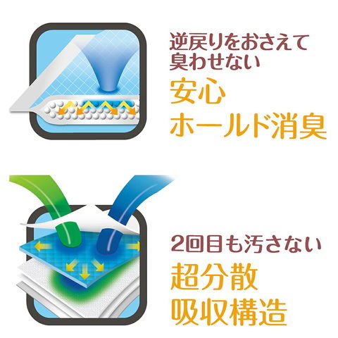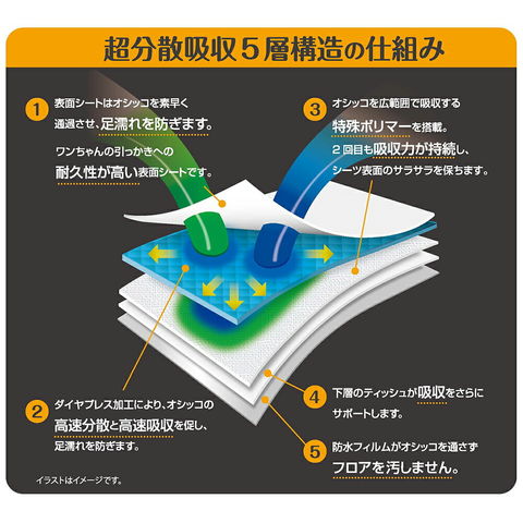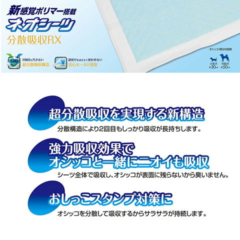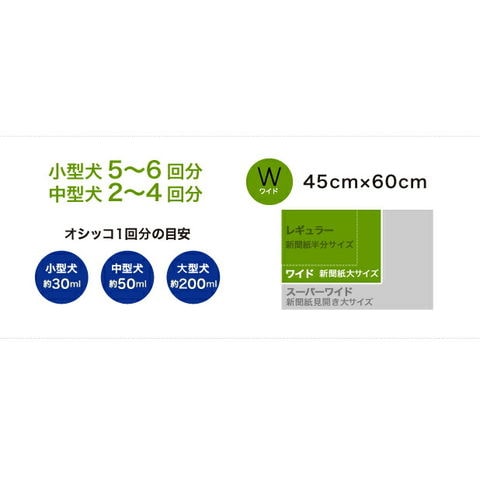 | 特長 | ●超分散吸収を実現する新構造です。 ●強力吸収効果でオシッコと一緒にニオイも吸収。 ●オシッコをスピード吸収し、広がりを抑え、表面をサラサラに保ち、逆戻りを抑えます。 ●安心の国産品です。 ●小型犬1回分の目安で30cc、中型犬1回分目安で50ccオシッコを吸収できます。 |
