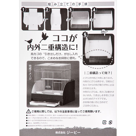 | 特長 | ●餌かす、羽根などの鳥かごからの飛び散りを抑えるケージカバーです。 ●組立簡単で、たった5アクションですぐに使えます。 ●内側が撥水シート加工なので、水に濡れても安心です。 ●鳥かごの引き出しだけが出し入れできるので、こまめなお掃除に便利です。 ●「ジービー 325ケージ」にピッタリのサイズです。 |