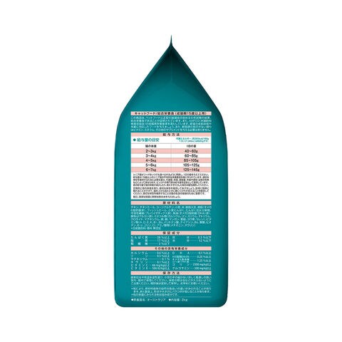 原材料 チキン、チキンミール、コーングルテン、小麦、米、脱脂大豆、鶏脂(オメガ6脂肪酸源)、フィッシュミール、小麦たんぱく、たんぱく加水分解物、可溶性繊維(プレバイオティクス源)、魚油(オメガ3脂肪酸(DHA)源)、酵母(βグルカン源)、ミネラル類(カルシウム、リン、カリウム、ナトリウム、クロライド、マグネシウム、鉄、銅、マンガン、亜鉛、ヨウ素、セレン)、ビタミン類(A、D、E、K、B1、B2、パントテン酸、ナイアシン、B6、葉酸、ビオチン、B12、コリン、C)、アミノ酸類(メチオニン、タウリン)