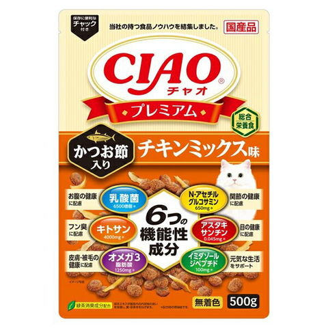 メーカー画像 いなば CIAOプレミアム 500g かつお節入り チキンミックス味 500g ×12 2250003130992 20250107 y25m01 ktym 猫 ねこ ネコ 猫フード キャットフード かりかり カリカリ 総合栄養食 チキン味 かつお節 チキン チキンミックス 国産 日本産 CAT 愛猫 栄養食 鶏 フィッシュ 魚 複数売り 4901133367441