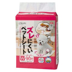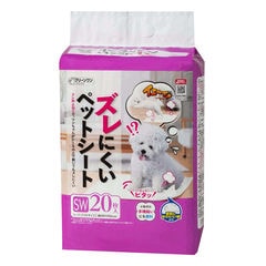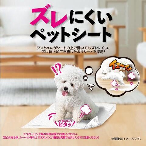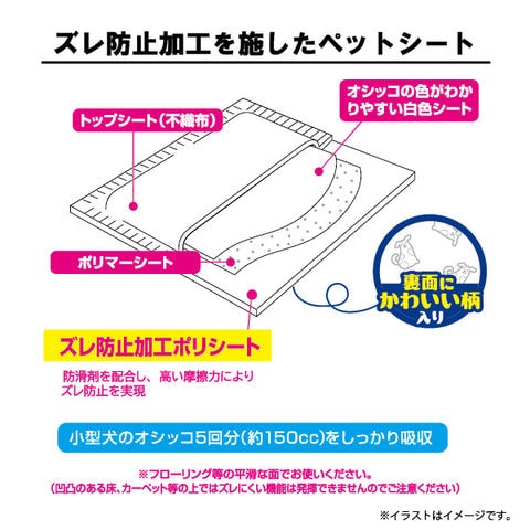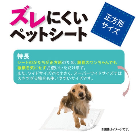 | 特長 | ●ペットがシートの上で動いてもズレにくい、ズレ防止加工をバックシートに施したペットシートです。 ●どの向きでオシッコしてもはみ出しにくい正方形サイズです。 |