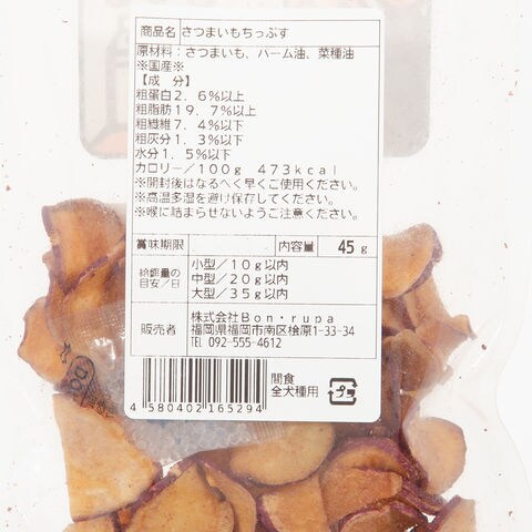 ボンルパ Bon-rupa さつまいもちっぷす 45g 4580402165294 20250121 y25m01 Kbsk 犬 犬フード ドッグフード ドッグ いぬ イヌ 犬おやつ おやつ 間食 ご褒美 ナチュラル 全犬種 日本産 日本製 国産 無添加 サツマイモチップス さつまいも さつま芋 サツマイモ 薩摩芋 チップス 薄切り スライス 真空乾燥フライ 乾燥 フライ 揚げ 揚げ物 melma2508potato