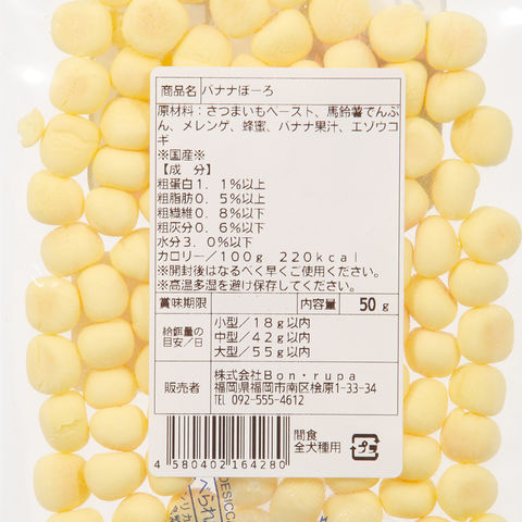 ボンルパ Bon-rupa バナナぼーろ 50g 4580402164280 20250121 y25m01 Kbsk 犬 犬フード ドッグフード ドッグ いぬ 犬おやつ おやつ 間食 ご褒美 ナチュラル 全犬種 日本産 日本製 国産 無添加 ばなな ボーロ さつまいも 薩摩芋 さつま芋 馬鈴薯でんぷん 馬鈴薯 ジャガイモ デンプン 澱粉 蜂蜜 はちみつ 子犬 仔犬 幼犬 老犬 シニア犬 シニア シニア期 bnr2504dogfod