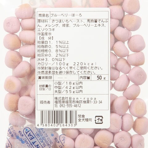 ボンルパ Bon-rupa ブルーベリーぼーろ 50g 4580402164303 20250121 y25m01 Kbsk 犬 犬フード ドッグフード ドッグ いぬ 犬おやつ おやつ 間食 ご褒美 ナチュラル 全犬種 日本産 日本製 国産 無添加 ブルーベリー ボーロ 老犬 シニア犬 シニア シニア期 幼犬 子犬 仔犬 馬鈴薯でんぷん 馬鈴薯 じゃがいも デンプン 澱粉 さつま芋 サツマイモ 薩摩芋 はちみつ 蜂蜜