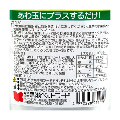 黒瀬ペットフード ヒナ用のごはん&給餌スプーンセット 黒瀬ペットフード 手のりひな鳥のごはん 120g 4972228251259 小動物 鳥 フード 餌 エサ 飼料 雛 ひな 雛鳥 とうもろこし粉末 米粉 麦粉 ピーナッツ粉 大豆粉 卵黄粉 小型インコ セキセイインコ 文鳥 ブンチョウ カナリア フィンチ 中型インコ オカメインコ 自然派宣言 あわたま 180g ヒナ鳥 親鳥 発情増進 換羽期 4972228252140 むきあわ あわ シニア インコ ジュウシマツ 十姉妹 カナリヤ 食事 kuroseshizen NPF エクセル スプーンセット 4932804354118 小鳥 餌入れ エサ入れ 水入れ 給餌器 小鳥用品 粟 粟玉 4972228230704 自然派 粟の穂 ハーフカット 6本入り おやつ小動物 おやつ 種 穀物 アワの穂 粟穂 黒瀬 自・然・派・宣・言 穂 20250115 kak y25m01