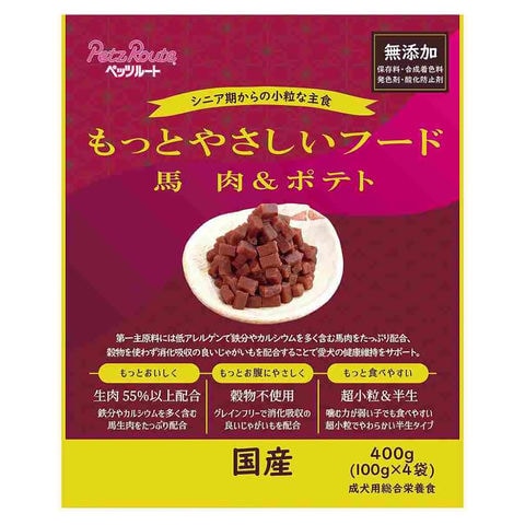 メーカー画像 ペッツルート もっとやさしいフード 馬肉&ポテト 400g(100g×4袋) ドッグフード 4984937683795 20250205 y25m02 Kbsk 犬 犬フード ドッグ いぬ イヌ フード ご飯 ごはん ポテト ジャガイモ じゃがいも じゃが芋 セミモイスト 半生 穀物不使用 グレインフリー 国産 日本産 シニア期 シニア犬 老犬 無添加 小粒 やわらかい 柔らかい 成犬 成犬用 総合栄養食 健康維持 超小型犬 ハイシニア 主食 スーパープレミアムフード 食べやすい 超小粒 腸内環境 グルコマンナン ビール酵母 DHA EPA 分包 馬肉 うま 馬 ウマ 鉄分 カルシウム 生肉 鶏肉 鶏ささみ ササミ ささみ 高たんぱく たんぱく質 opa2_choku