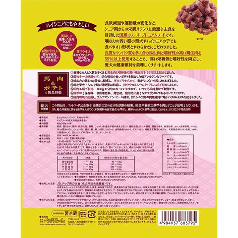 | 特長 | ●アレルギーに配慮し、穀物を一切使わず、消化吸収の良いポテトを配合したフードです。 ●新鮮さと美味しさにこだわり、栄養価の高い生の馬肉と嗜好性の高い鶏肉を55%以上配合しました。 ●噛む力の弱まった愛犬に配慮し、半生でやわらかく、転がりにくい小粒に仕上げました。 ●超小型・シニア期の活動量に配慮し、鉄分とカルシウムをバランスよく配合しました。 |