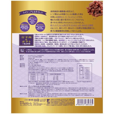 | 特長 | ●アレルギーに配慮し、穀物を一切使わず、消化吸収の良いポテトを配合したフードです。 ●低コレステロールで良質なたんぱく質を多く含むラム肉(仔羊)を50%以上配合しました。 ●噛む力の弱まった愛犬に配慮し、半生でやわらかく、転がりにくい小粒に仕上げました。 ●超小型・シニア期の運動量に配慮し、脂肪燃焼にL-カルニチンを含むラム肉(仔羊)を配合しました。 |