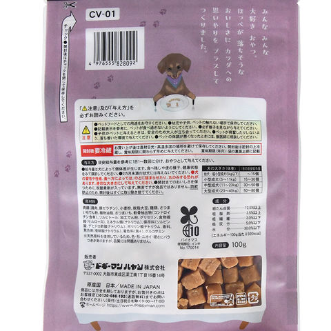 | ご注意 | ※本品は犬用です。生後2ヵ月未満の幼犬には与えないでください。 ※犬の習性や性格、食べ方によってはのどに詰まらせたり、丸のみする恐れがありますので、適切な大きさにして与えてください。 ※開封後は密封の上冷蔵し、賞味期限に関わらず早めに与えてください。 |