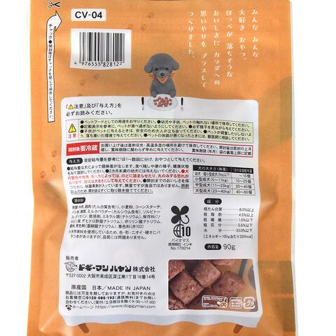 | ご注意 | ※本品は犬用です。生後2ヵ月未満の幼犬には与えないでください。 ※犬の習性や性格、食べ方によってはのどに詰まらせたり、丸のみする恐れがありますので、適切な大きさにして与えてください。 ※開封後は密封の上冷蔵し、賞味期限に関わらず早めに与えてください。 |
