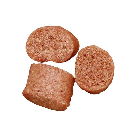 | 原材料 | 肉類(牛肉、鶏肉<たん白質含有>)、小麦粉、コーンスターチ、パン粉、糖類、ミルクパウダー(カルシウム含有)、ソルビトール、グリセリン、膨張剤、ミネラル類(ナトリウム)、保存料(ソルビン酸、デヒドロ酢酸ナトリウム)、ポリリン酸ナトリウム、香料、発色剤(亜硝酸ナトリウム)、着色料(赤102) |