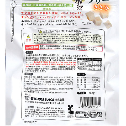 | 原材料 | 肉類(鶏ササミ、鶏胸肉、鶏肉)、米粉、糖類、タピオカでん粉、コラーゲンペプチド、軟骨抽出物(コンドロイチン含有)、グリセリン、トレハロース、ソルビトール、膨張剤、ミネラル類(ナトリウム)、ポリリン酸ナトリウム、着色料(クチナシ、マリーゴールド)、グルコサミン |
