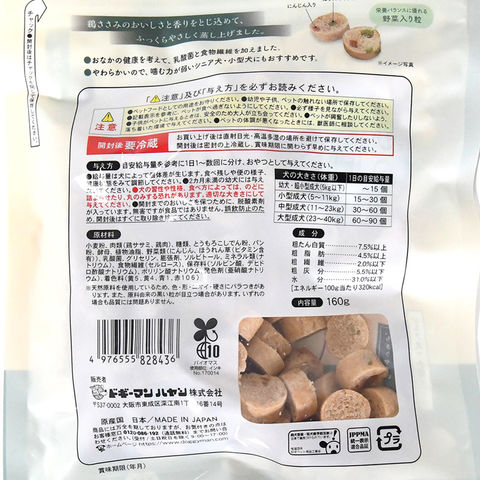 | 特長 | ●鶏ささみのおいしさと香りを閉じ込めた生地に野菜を入れて、ふっくらやさしく蒸し上げたスナックです。 ●ちぎりやすく食べやすいやわらか仕立てで、小型犬・シニア犬にもおすすめです。 ●おなかの健康を考えて、乳酸菌と食物繊維を加えました。栄養バランスに優れる野菜入りです。 |