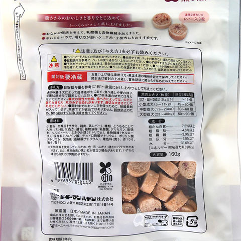 | 特長 | ●鶏ささみのおいしさと香りを閉じ込めた生地を、ふっくらやさしく蒸し上げたスナックです。 ●ちぎりやすく食べやすいやわらか仕立てで、小型犬・シニア犬にもおすすめです。 ●おなかの健康を考えて、乳酸菌と食物繊維を加えました。濃厚な香りと味わいのレバー入りです。 |