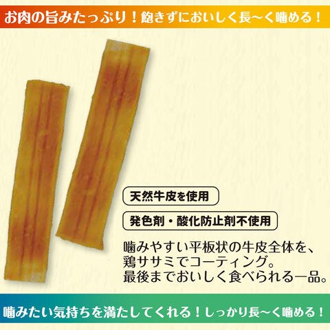| 特長 | ●発色剤、酸化防止剤不使用、天然牛皮をササミでコーティングした平板状のデンタルケアガムです。 ●ガムが苦手なワンちゃんに向けて、おいしく長く噛めるガムを作りました。 ●平板状のガムにササミをコーティングしているので、噛めば噛むほど旨味が溢れます。 |