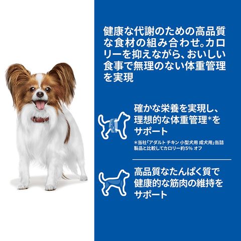 | 特長 | ●健康な代謝のための高品質な食材の組み合わせです。 ●カロリーを抑えながら、おいしい食事で無理のない体重管理を実現します。 ●確かな栄養を実現し、理想的な体重管理*をサポートします。 *当社「アダルト チキン 小型犬用 成犬用」缶詰製品と比較してカロリー約5%オフ ●高品質なたんぱく質で健康的な筋肉の維持をサポートします。 |