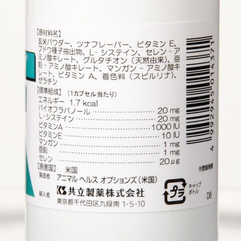 | 原材料 | 玄米パウダー、ツナフレーバー、ビタミンE、ブドウ種子抽出物、L-システイン、セレン-アミノ酸キレート、グルタチオン(天然由来)、亜鉛-アミノ酸キレート、マンガン-アミノ酸キレート、ビタミンA、着色料(スピルリナ)、ゼラチン |