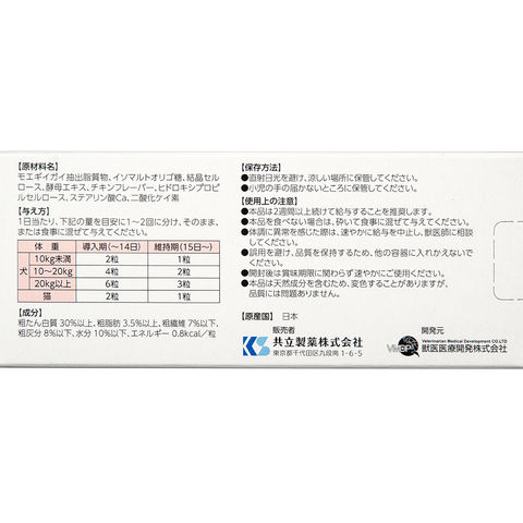 | 使用方法 | 1日当たり、下記の量を目安に1~2回に分け、そのまま、または食事に混ぜて与えてください。 ●導入期(~14日) 【犬】10kg未満:2粒、10~20kg:4粒、20kg以上:6粒 【猫】2粒 ●維持期(15日~) 【犬】10kg未満:1粒、10~20kg:2粒、20kg以上:3粒 【猫】1粒 |