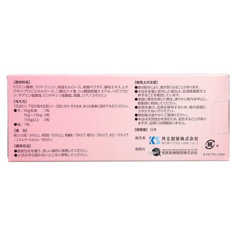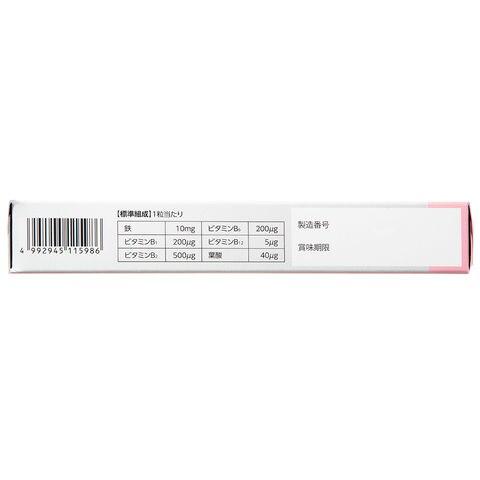 | 原材料 | ピロリン酸鉄、ラクトフェリン、結晶セルロース、魚類ペプチド、酵母エキス、ヒドロキシプロピルセルロース、二酸化ケイ素、ショ糖脂肪酸エステル、リボフラビン、チアミン塩酸塩、ピリドキシン塩酸塩、葉酸、シアノコバラミン |