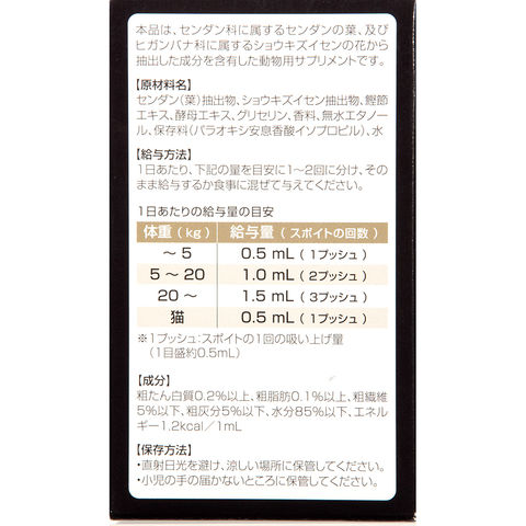 | 与え方 | 1日当たり、以下の量を目安に1~2回に分け、そのまま、または食事に混ぜて与えてください。 *1プッシュ:スポイト1回の吸い上げ量(1目盛約0.5ml) 【犬】 ~5kg:0.5ml(1プッシュ) 5~20kg:1.0ml(2プッシュ) 20kg~:1.5ml(3プッシュ) 【猫】 0.5ml(1プッシュ) |