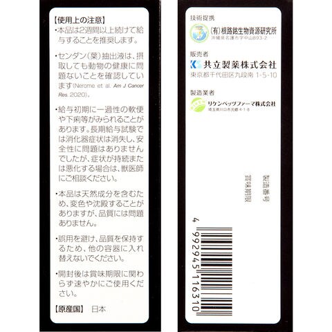 | 特長 | ●液状タイプの犬・猫用健康補助食品です。 ●センダン科に属するセンダンの葉、及びヒガンバナ科に属するショウキズイセンの花から抽出した成分を含有しています。 ●フレーバーを配合した液状タイプであるため、嗜好性が良く、容易に給与することができ、長期的な給与も可能です。 |
