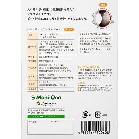 メーカー画像 Duo One Eye R(デュオワンアイアール) 犬猫用 180粒(60粒×3袋) 4562164190608 犬 イヌ いぬ 犬用 いぬ用 dog DOG 犬フード 健康補助食品 サプリメント 猫 ネコ ねこ 猫用 ねこ用 cat CAT 猫フード 健康補助食品 サプリメント 眼 目 網膜 アスタキサンチン ビタミンE ビール酵母 嗜好性 目の健康 眼の健康 錠剤 タブレット デュオワン アイ アール メニワン メニわん Meni One 国産 日本産 20250205 y25m02 ngtk