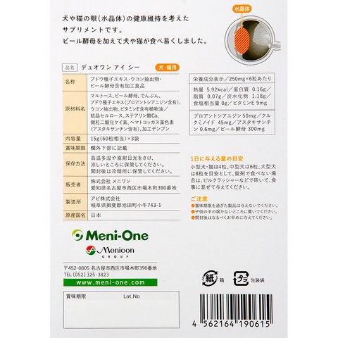 メーカー画像 Duo One Eye C(デュオワンアイシー) 犬猫用 180粒(60粒×3袋) 4562164190615 犬 イヌ いぬ 犬用 いぬ用 dog DOG 犬フード 健康補助食品 サプリメント 猫 ネコ ねこ 猫用 ねこ用 cat CAT 猫フード 健康補助食品 サプリメント 眼 目 水晶体 プロアントシアニジン クルクミノイド アスタキサンチン ビタミンE ビール酵母 嗜好性 目の健康 眼の健康 錠剤 タブレット デュオワン アイ シー メニワン メニわん Meni One 国産 日本産 20250205 y25m02 ngtk